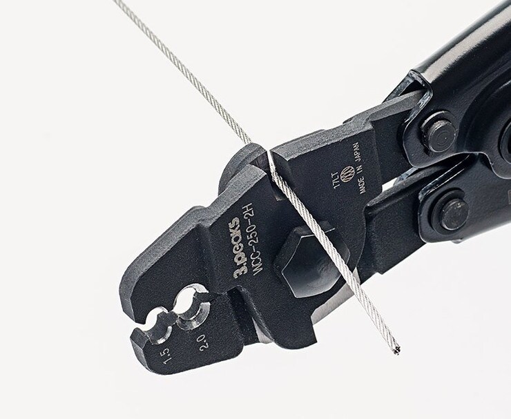 ワイヤーロープの切断、クランプ管の圧着が1丁で可能な工具です。