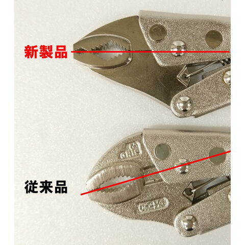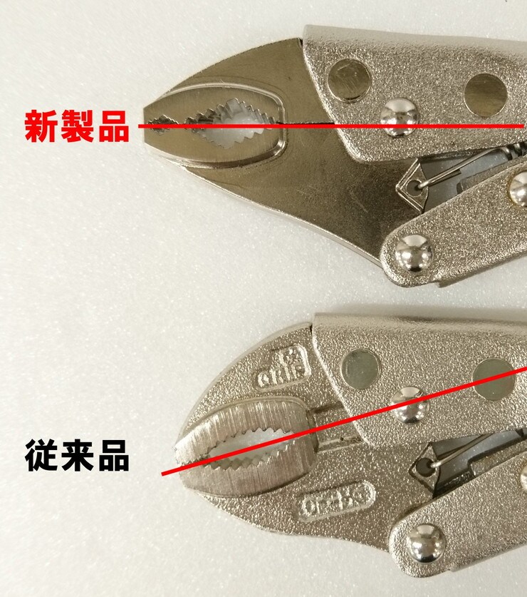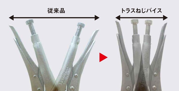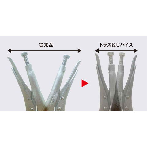 バイスプライヤーの形状を見直し、頭部をねじを回しやすい角度(水平)に取付けました。ハンドルの振り幅が狭くなりより使いやすくなりました。