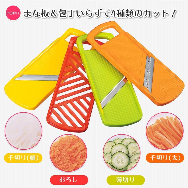 まな板&包丁いらずでおろし、スライス、千切り、つま切りの4種類のカットができます。