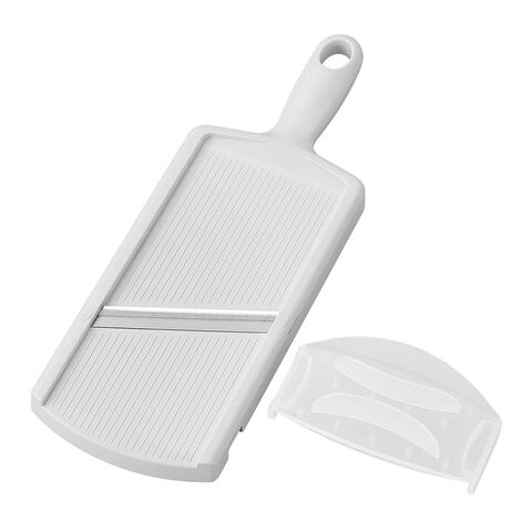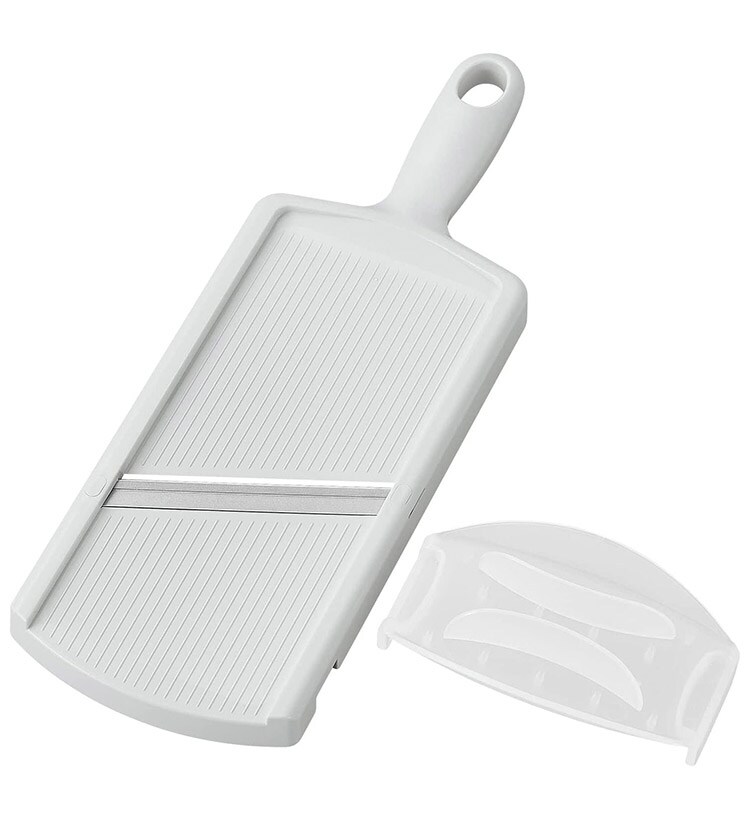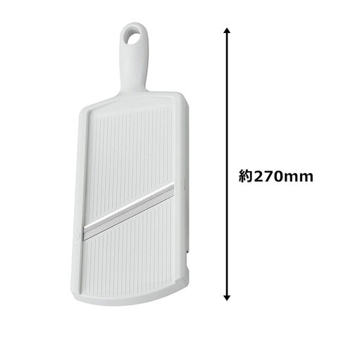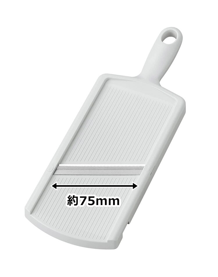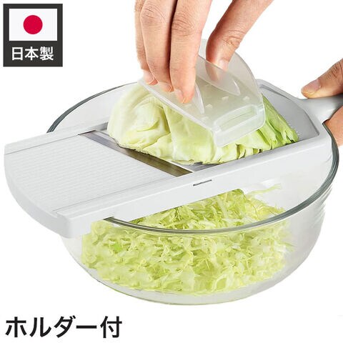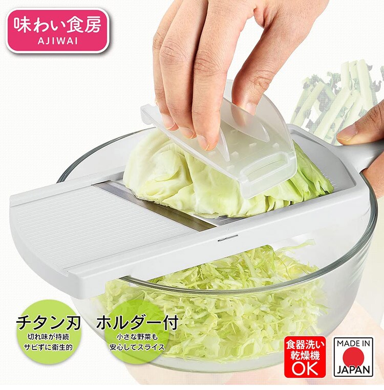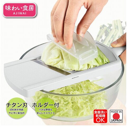 にんじんや玉ねぎ等野菜のスライス、きゅうりの輪切りにご使用頂けます。キャベツの千切りが手早くできます。ホルダー付きで、小さくなった野菜もスライスできます。刃はサビにくいチタン製で衛生的です。食器洗い乾燥機に対応します。