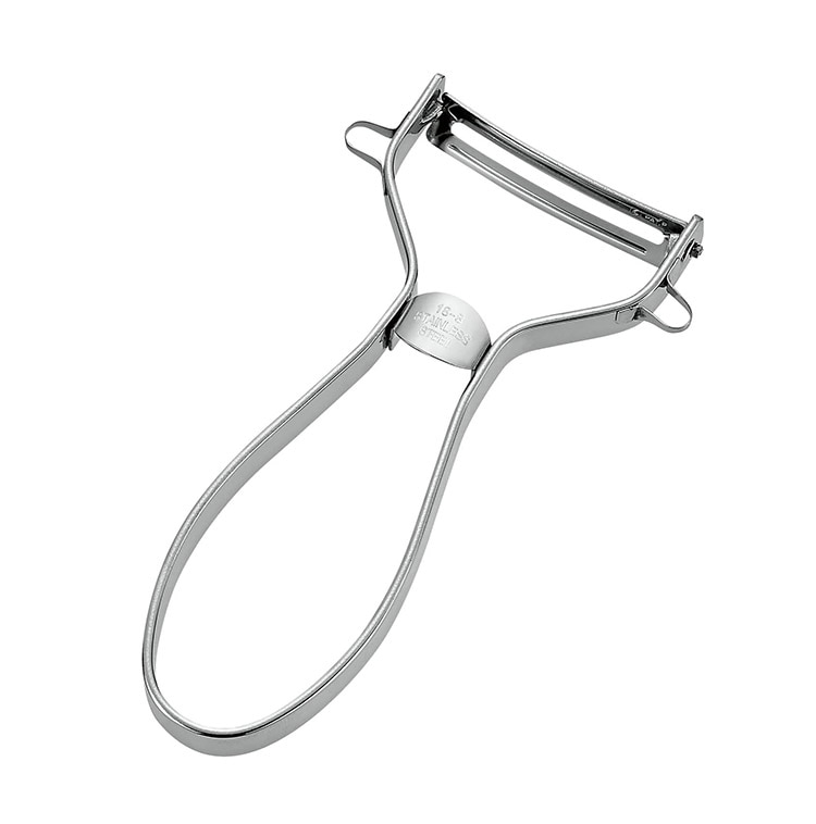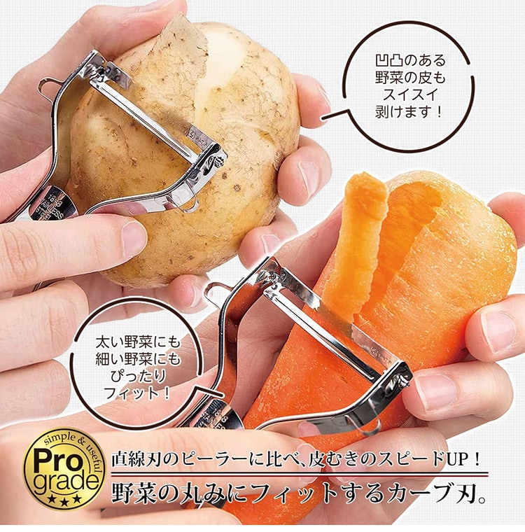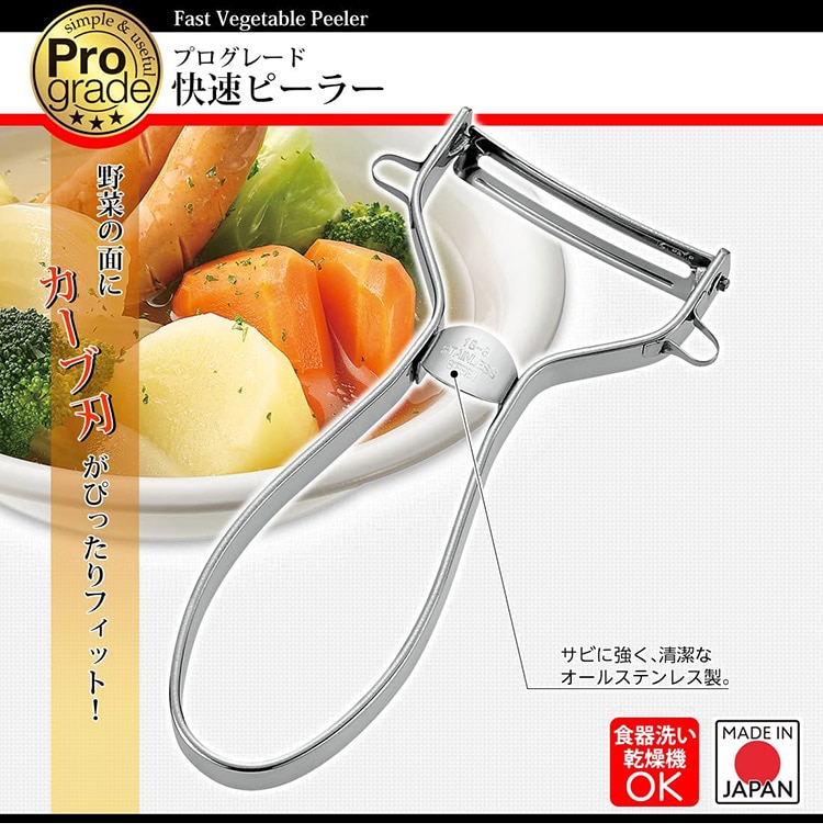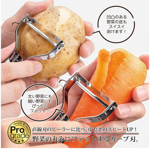 野菜の皮むき、下ごしらえにご利用下さい。燕三条製の刃で感動的な切れ味です。カーブ刃のあたる面が広く早く調理可能です。食器洗い乾燥機対応です。●芽取り付きです。