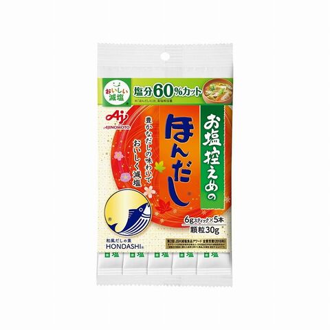 かつお節職人が燻し分けた3種のかつお節をふんだんに使い、更にやさしおのおいしく減塩する技術を使うことで、ほんだしのおいしさそのままに60%減塩です。濃厚なかつおだしのコクと味わいで、料理をおいしく仕上げます。