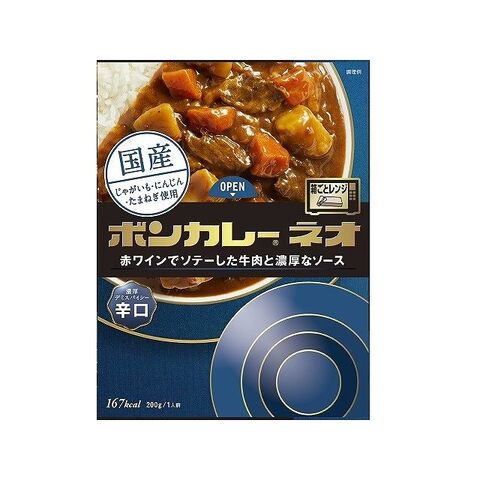 野菜(じゃがいも(国産)、にんじん)、ソテーオニオン、牛肉、砂糖、小麦粉、カレー粉、ビーフエキス、豚脂、デミグラスソース、食塩、濃縮乳、赤ワイン、マンゴーチャツネ、おろしにんにく、オニオンペースト、ぶどう果汁、香辛料、濃縮トマト、ウスターソース/増粘剤(加工デンプン)、調味料(アミノ酸等)、カラメル色素、パプリカ色素、香料、リンゴ抽出物、(一部に小麦・乳成分・牛肉・ごま・大豆・鶏肉・豚肉・りんご・ゼラチンを含む)