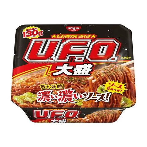 旨さ凝縮、濃い濃いソースが旨い!日清焼そばU.F.O.の大盛サイズ。具材は、大切りキャベツと豚肉、別添で青のりと紅生姜のふりかけ付です。