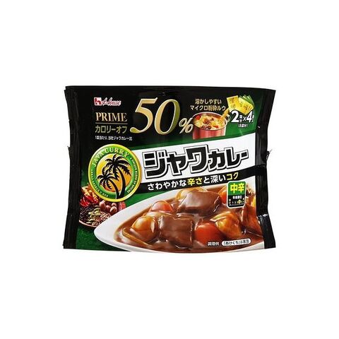 オニオン、ガーリックのコクと香辛料のさわやかな香り、キレのある辛さが特徴の、スパイシーなおいしさとカロリー・脂質50%オフを実現した中辛カレー(1皿あたり、ジャワカレーと比べて)・使い勝手の良い分包タイプ(2皿分x4袋入)、溶かしやすいマイクロ粉砕ルウです。