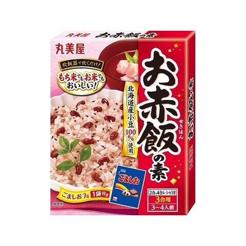 [赤飯の素]小豆(北海道産)、砂糖、小豆抽出液、食塩/乳酸カルシウム、重曹[ごましお]いりごま、食塩、でん粉、海藻カルシウム/調味料(アミノ酸等)、(一部にごまを含む)