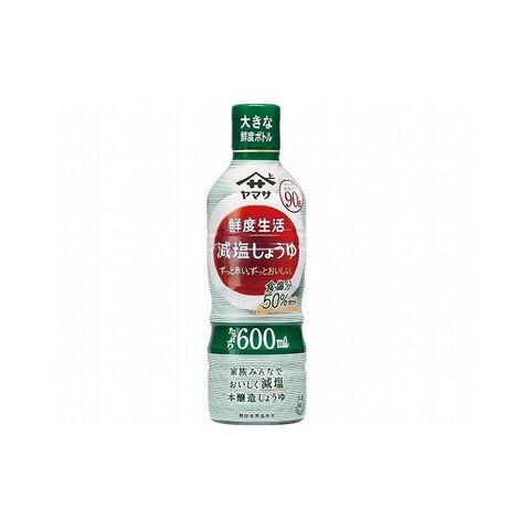 液量調節がしやすいたっぷり600mlの鮮度ボトル。食塩分50%カットの減塩しょうゆです。
