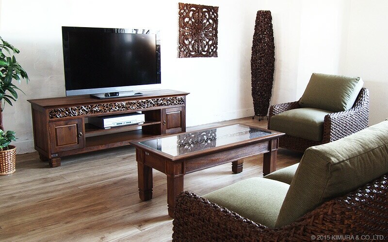 お部屋が上級アジアンスタイルに一変。テーブルのガラス天板の下部には豪華なインドネシアの職人による手彫の彫刻が施されています。アジアンエスニックで高級感あるデザインです。木目が緻密で、乾燥による狂いが少なく、耐久性の高い「チークの木」は、その木質の良さから家具に最適な「高級木材」として知られています。チーク無垢材でつくられたインテリアは使っていると劣化していく化粧合板などの成形品と違い、 大切に使えば使う程風合いが増し、味わい深いビンテージな家具に変化していきます。メーカーがデザインから製造までを一貫して行う事で、丈夫で長持ちするよい素材を使用しつつ、お買い求めやすい価格を実現しています。