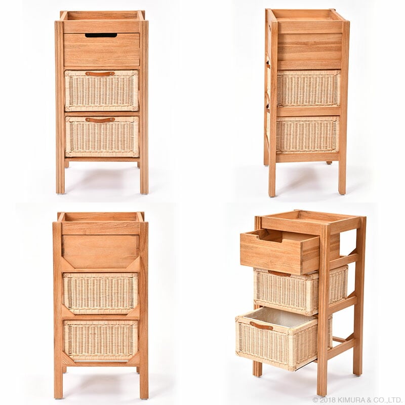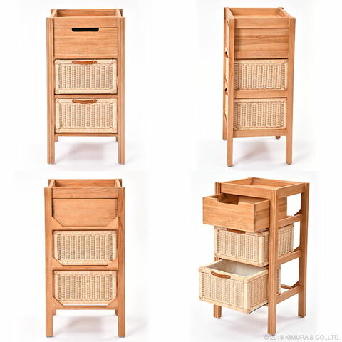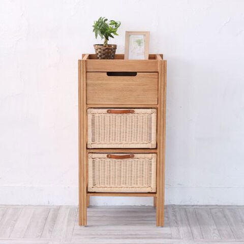 | ポイント | 世界三大銘木のチーク無垢材を使用。 すっきりとした見た目ながらも無垢材ならではの気品が漂う収納チェスト。 サンドブラスト加工をほどこしたチークの木肌は、 自然素材家具ならではの、やわらかく手に馴染みやすい感触。 引出しは手で編まれた温かみがそのまま伝わってくる、ラタン(籐)製内布付きのバスケット。 ランドリーやリビングチェストとして、幅広い用途でお使いいただけます。 |