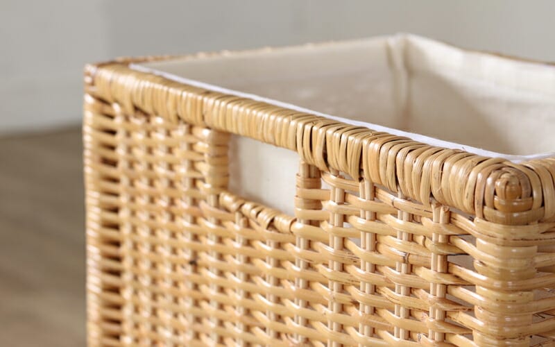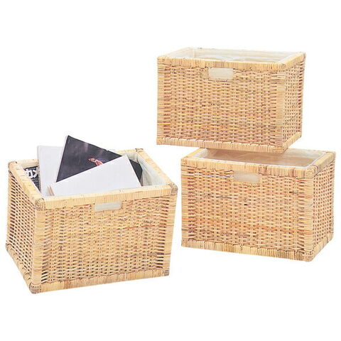 | ポイント | 市販のカラーボックスにピッタリのサイズで、散らかりがちな小物をスッキリ収納できるバスケット。 3個組でお得なセットです。 木製フレームに籐皮を編みこんでいるので、丈夫でしっかりとしたつくり。 内布付きなので中身が傷つきにくく、衣類もひっかかりなく収納できます。 また外から中身が見えません。 |