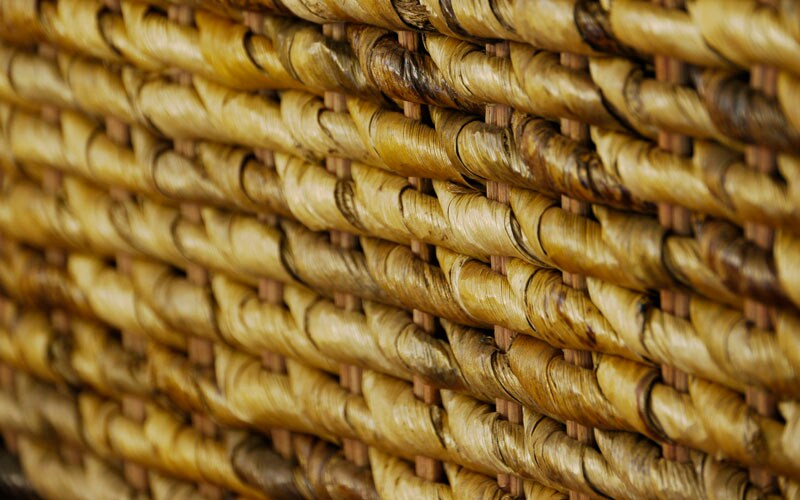 アメ色にいぶしたバナナの葉を乾燥、細かく撚って編みこみ家具に使用しています。