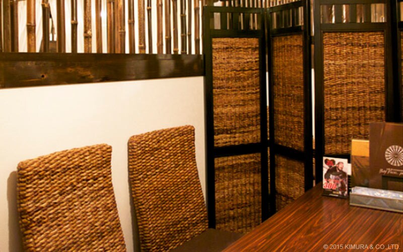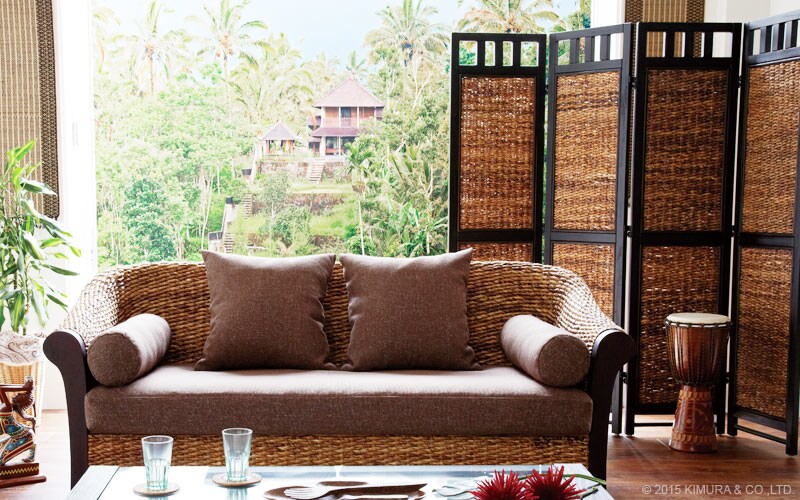 天然木×バナナリーフでつくられたパーティション。ナチュラルテイストな優しさと温かみあふれる風合い。