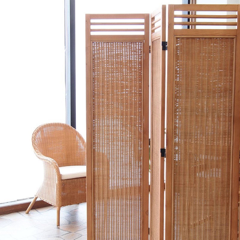 天然木のフレームにラタンの編み込みが美しいスクリーン。3連タイプ。天然素材の籐(ラタン)を、インドネシアの職人がひとつひとつ丁寧に編みあげています。まるでアジアのリゾート地で過ごしているような、くつろぎと癒しのリラックス空間を演出します。裏表が目立たないデザインで、山折り谷折り角度を自由に折り曲げられます。お部屋の間仕切りや目隠し、日差しよけに様々なシーンで大活躍。3色展開なので、アジアンテイスト、ナチュラルテイストなど、シーンに合わせて色をお選びいただけます。木部の表面をわざと凸凹にするサンドブラスト加工でアンティーク風に仕上げています。 商品サイズ:幅40×奥行き2.5×高さ160cm(約)(1枚あたり)材質:籐、天然木、ラッカー塗装生産国:インドネシア製仕様:完成品備考:※天然素材を使用している為、大きさ、色味に若干の個体差がございます。