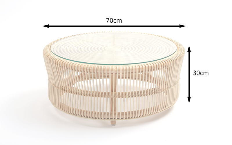 円形のラタンフレームが美しいローテーブル。繊細な表情ながら、職人による丈夫な作りで長くお使いいただけます。透け感がある軽やかなデザインで、圧迫感がなくお部屋に馴染みます。籐製なので、軽くて持ち運びが楽々。リビングテーブルとしてソファに合わせたり、座卓として和室や床座スタイルに合わせたり、和室・洋室問わず様々なテイストに合わせてお使いいただけます。 商品サイズ:幅70×奥行き70×高さ30cm(約)材質:ラタン(籐)、ガラス、ラッカー塗装生産国:インドネシア製仕様:完成品備考:※天然素材を使用している為、大きさ、色味に若干の個体差がございます。