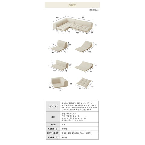 コーナー部分:幅75×奥行き75×高さ35(座面高12)cm