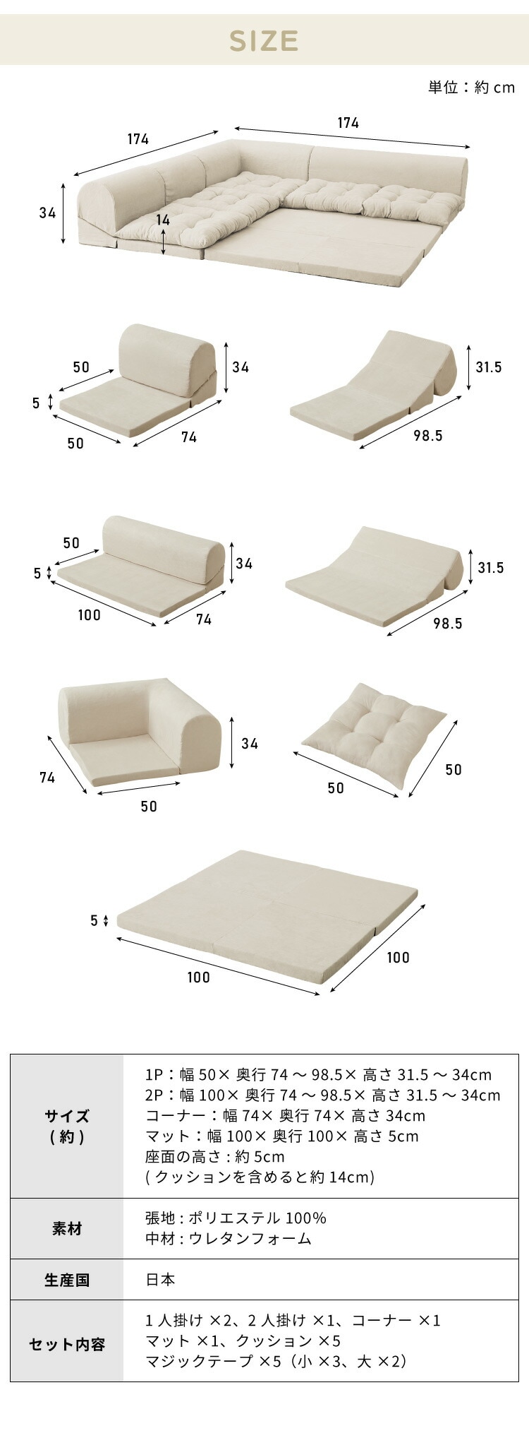 1P:幅50×奥行74~98.5×高さ31.5~34cm