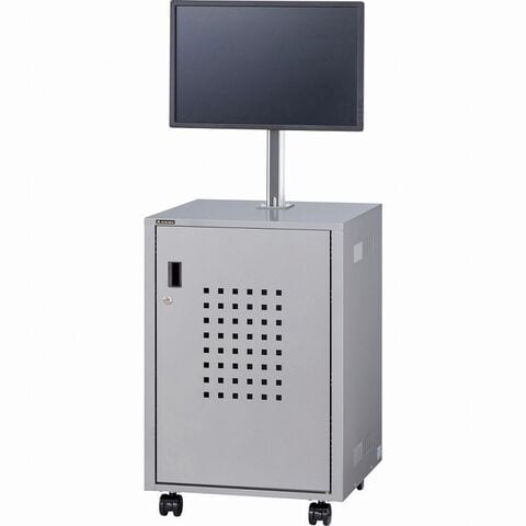 VESAピッチ75mm~200mm、~40インチのディスプレイが設置可能な鍵付きのスチールラック。機器のサポートアングルとして使えるユーティリティ金具付属。