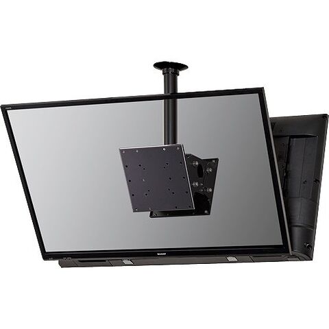 耐震計算に基づいた安全設計。1本のパイプでディスプレイ2台を両面設置。便利な機器収納スペース付き。