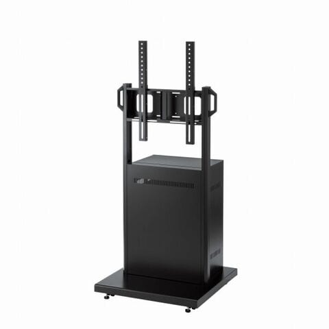 42~55型程度までのディスプレイに対応しています。(ディスプレイ耐荷重30kg)大型STBや、スピーカー、メンテナンス用品などを収納できる鍵付きの大型のボックスタイプです。(有効内寸W429xD342xH650mm)VESA取り付け100x100、100x200、100x300、100x400、200x100、200x200、200x300、200x400、300x100、300x200、300x300、300x400、400x100、400x200、400x300、400x400に対応しています。初期設定で1100mm/1200mm/1300mm(ブラケット中心)の位置にディスプレイを取り付け出来ます。設置場所やコンテンツの表示方向に合わせて、ディスプレイの縦・横両方向の取付けが可能です。移動に便利なハンドルと径50のキャスター付きで、設置時にはアジャスターでしっかりと固定できます。アジャスター使用時には転倒角前後左右15度以上になるように設計した製品です。支柱内に配線スペースがあり、ケーブルを綺麗に隠して配線が可能です。ブラケット部には小型STBなどを設置するのに便利な収納スペースがあります。ブラケット裏面にVESA100x100の取り付け穴があり、VESA100x100対応の機器を取り付け可能です。(MR-VESA10、10L等)底板の角は安全性を考慮した丸みを帯びた設計を採用しています。※ディスプレイのVESA穴が中央部にない機種の場合、縦向きに設置すると中心が左右にずれてしまう場合があります。※キャスターを装備しておりますが、ディスプレイを設置した状態での長距離の移動、移動させながらの使用を想定した構造にはなっておりません。
