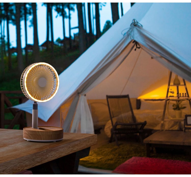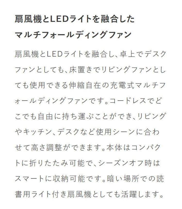 扇風機とLEDライトを融合し、卓上でデスクファンとしても、床置きでリビングファンとしても使用できる伸縮自在の充電式マルチフォールディングファンです。