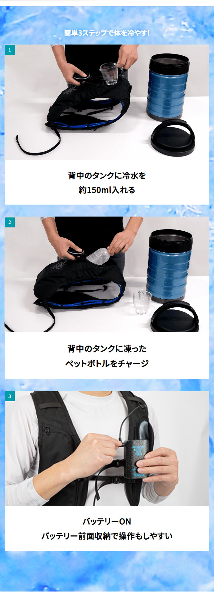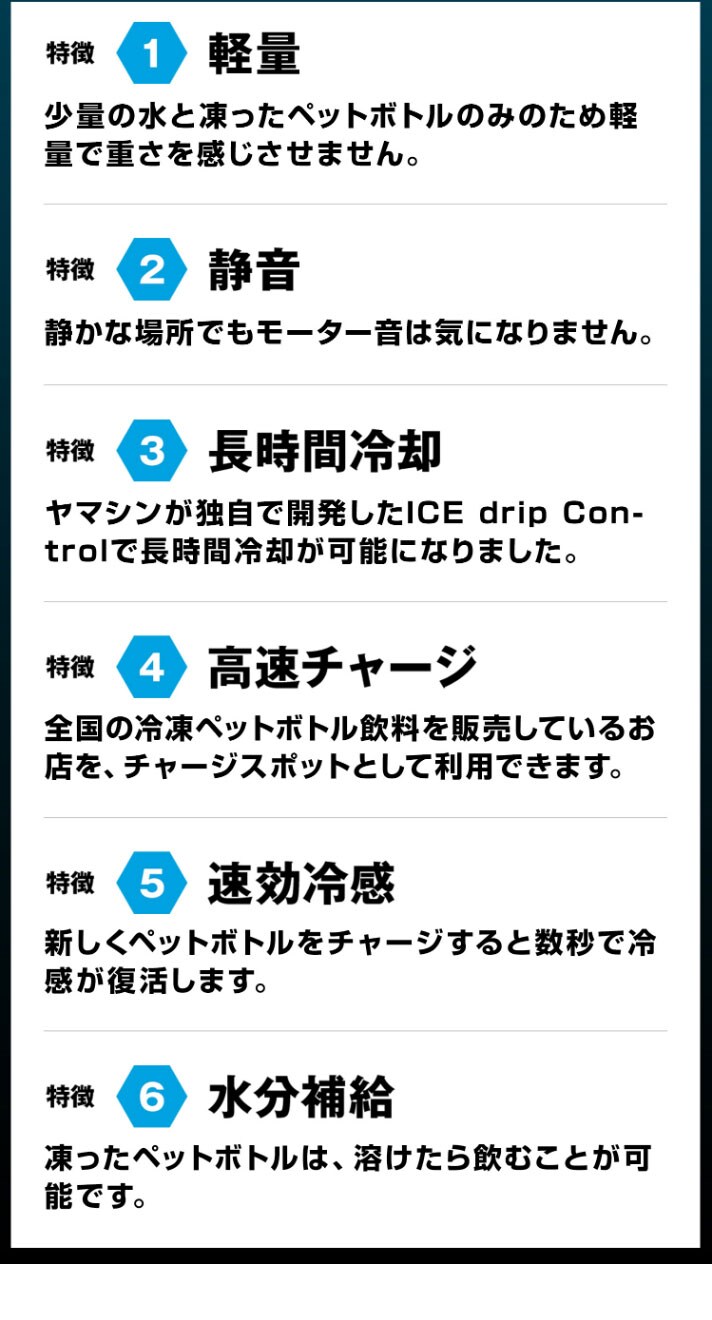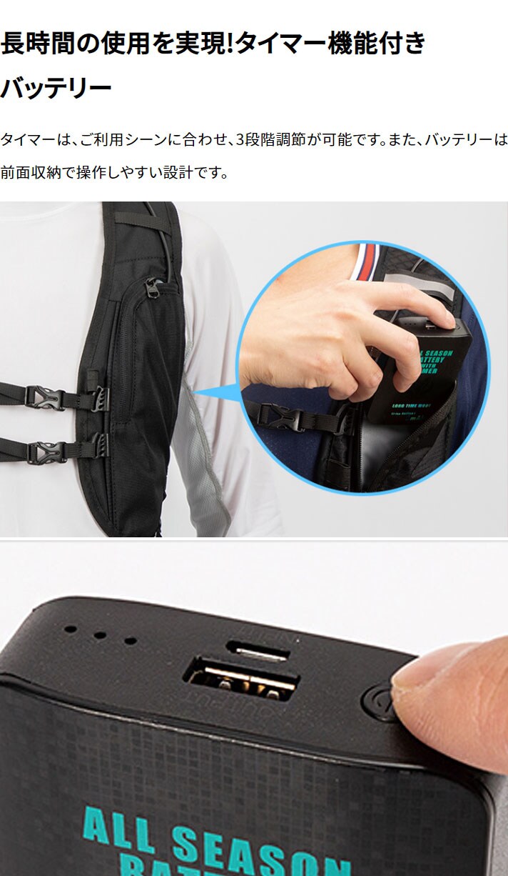 タイマーモード付バッテリーを使用して、凍らせたペットボトル1本で約3時間の冷却可能です。
