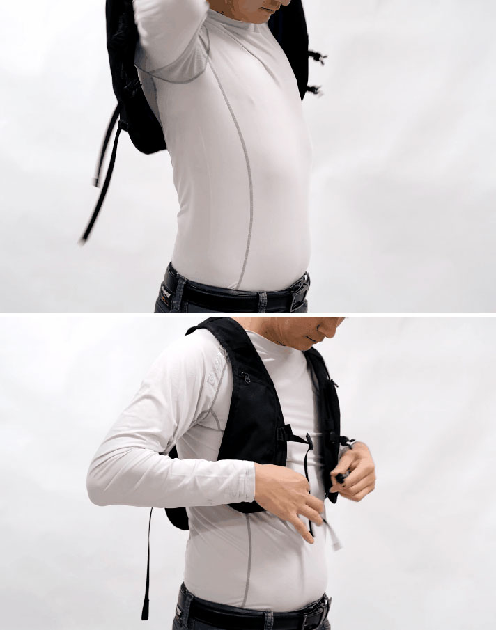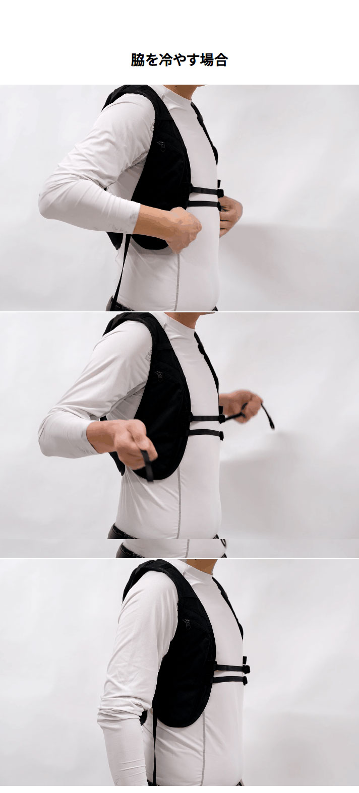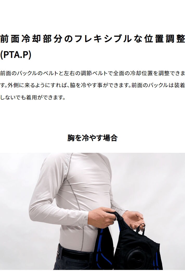 胸元、脇まで冷却可能(脇部分までホース位置調整可能でより冷却感UP)です。