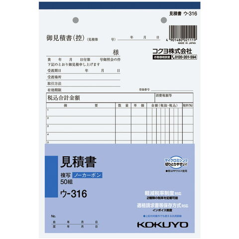 コクヨ NC複写簿ノーカーボン見積書A5タテ型 ウ-316