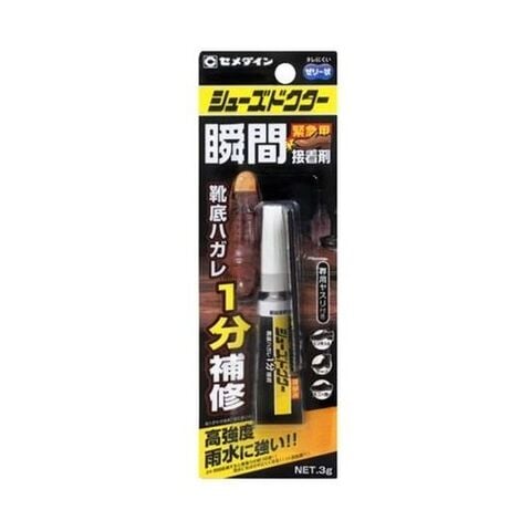 靴底はがれ、1分補修【特長】・靴の補修用の瞬間接着剤です。・高強度で素早く接着できます。靴底を貼りあわせた後、約1分で密着し歩行可能です。・接着後約24時間で完全に硬化します。また耐水性に優れているため、雨水がかかってもはがれにくいです。・使いやすいゼリー状タイプのため、しみこみにくく、革靴、パンプス、スニーカーなどさまざまなな靴にご対応いただけます。【使用方法】(1)靴底の接着面が水ぬれしている場合はあらかじめ水分を拭き取ってから、付属のサンドペーパーで接着面を研磨します。(2)接着面の片面に本製品を少量塗布し、貼り位置を確認し接着剤を薄く押し広げるように接着面同士を貼り合わせます。(3)接着面同士を強く密着させた状態で約1分間押さえることで歩ける程度の実用強度に達します。24時間静置いただくことで、より強力に接着でき雨水にもはがれにくくなります。・ぬれた状態で接着作業を行った場合、充分接着しません。・接着面積、塗布量、湿度、温度、素材など様々な条件によっては、1分以上接着時間を要する場合があります。・素早く強固に硬化するため、開封後はなるべく早く使い切ってください。