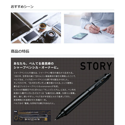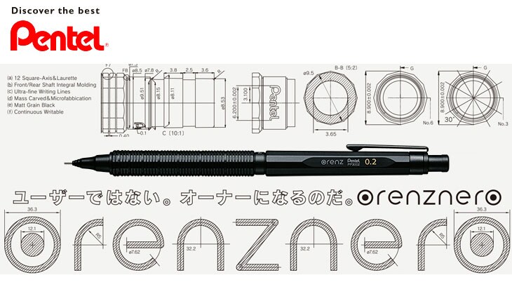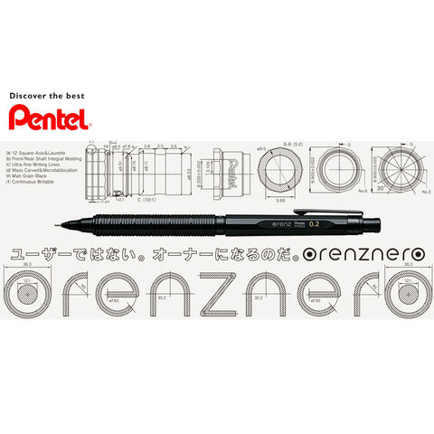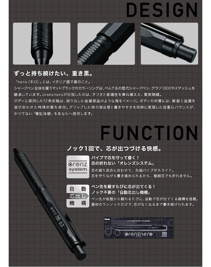 最初に一回ノックするだけで、自動で芯が出てくる自動芯出し機構を備えているので、芯がなくなるまで書き続けることができる。ボディの材質は樹脂と金属を混ぜ合わせた特殊素材を使用。低重心バランスが安定した筆記を提供。