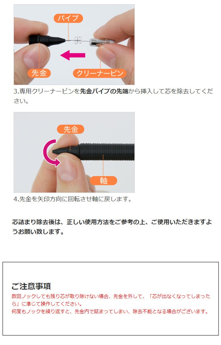 【3】残り芯が短くなると、パイプが急に引っ込むようになります。ノックして残り芯を捨ててください。