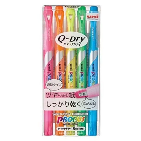 ペン先の窓から文字が見えてラインが引きやすい蛍光ペン「プロパス・ウィンドウ」の速乾タイプ、その5色セット。速乾性と定着性に優れた「QーDry(クイックドライ)インク」が、紙を選ばず、早くしっかり乾きます。*太字角芯+細字丸芯のツインタイプ。*インク乾燥時間は、従来品「プロパス・ウィンドウ」の約3分の1。※一部画像に他のカラーの商品を使用しています。インクカラー:ピンク、オレンジ、イエロー、グリーン、スカイブルー。線巾:細字丸芯0.6mm/太字角芯4mm。水性顔料。
