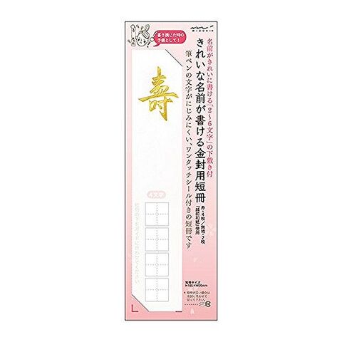 きれいな名前が書ける金封用短冊【特長】・筆ペンの文字がにじみにくい金封用短冊です。・名前がきれいに書ける「2~6文字」の下敷き付き。・ワンタッチシール付き。・書き損じたときの予備に。【セット内容】・寿 4枚、無地 2枚【注意】・短冊が長い場合は金封に合わせて切ってください。・ご使用になる筆記具によっては、乾きが遅い場合があります。・無地の短冊はツルツルした面を表にして使用してください。