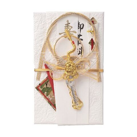 鶴の飾りが品と華やかさがある大判タイプの金封です。婚礼用にはもちろん、結納の際の目録、金包みとしてもご利用いただけます。入れる金額によって水引の後ろの結び目が調節できます。(300万円まで入ります。)金封本体サイズ:135×215mm。「寿」、「御結婚御祝」、「御帯料」、「御袴料」、「目録」の短冊5枚入。中包(多当タイプ)、目録用中紙付。1枚入。