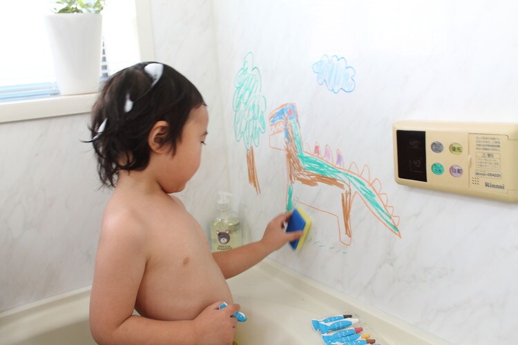 おふろの壁、浴槽に描けて消せる筆記具です。米糠から採れるワックスを使用しており、濡れたところにも描けます。使用後は付属の収納ネットに入れてお片付けが簡単にできます。
