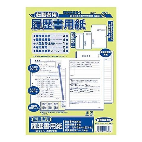 ◆内容:写真用両面シール4片付◆枚数:本文4枚・職務経歴書4枚・大型封筒1枚・定型封筒2枚付◆転職者用