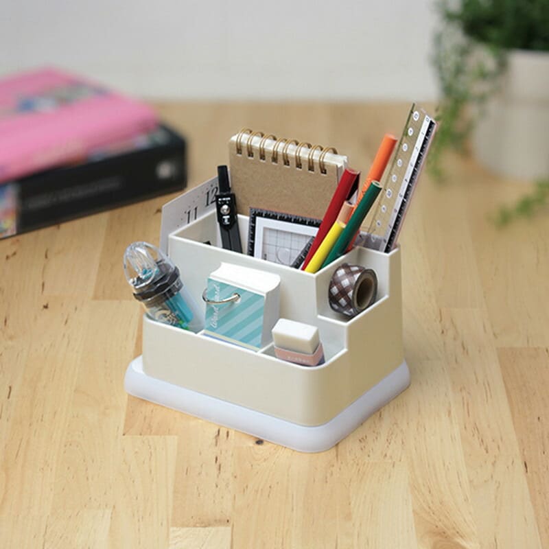 文具類を効率よく収納できるシンプルなペンスタンドです。リビングにマッチするデザイン・カラーリングです。底面にはペン先などが傷みにくいソフトな素材を使用。ハサミやクリップ、メモなども一緒に収納可能。