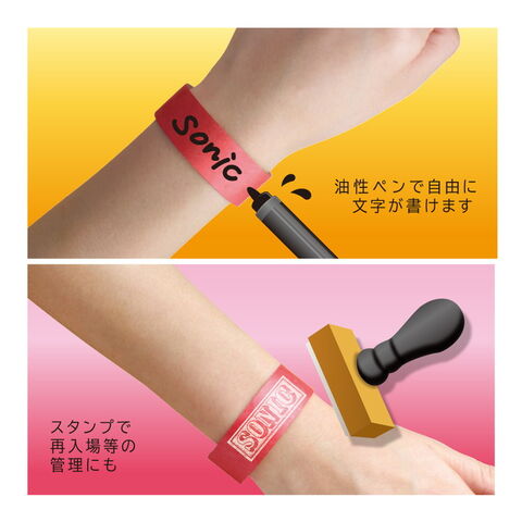 一度外すと再装着不可能ですので不正入場などの防止に役立ちます防水性能に優れており海やプールでも使用できます豊富なカラーバリエーションはスポーツ大会などグループ分けにも油性ペンで文字を書いたり油性スタンプで印を付ける事が出来ます