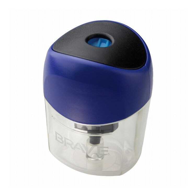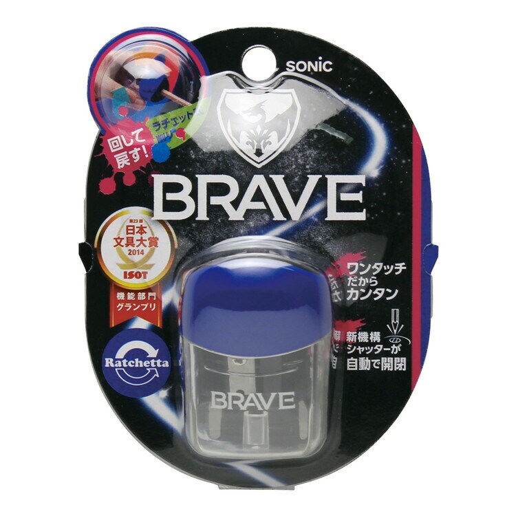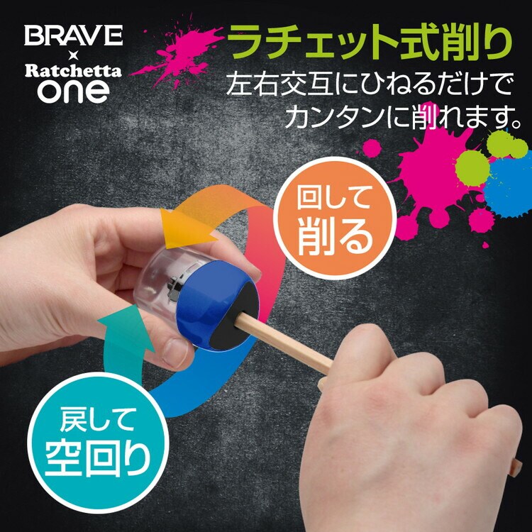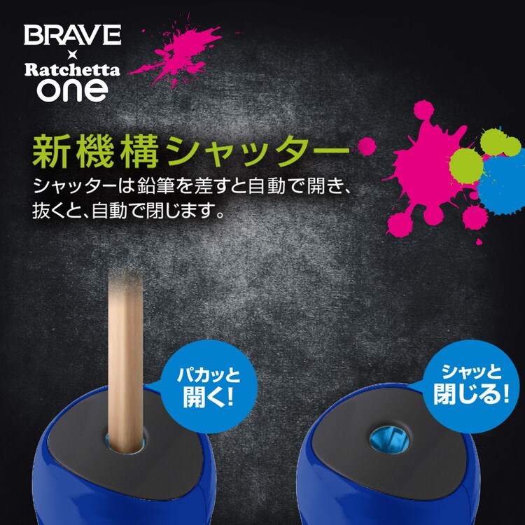 いつでも どこでも だれでも ワンタッチで削れるもっとも簡単なハンディ鉛筆削りラチェット式削りで、左右交互にひねるだけでカンタンに削れます。新機構!シャッターキャップは鉛筆を差すと自動でパカッと開き、抜くと、シャッと自動で閉じます。フタを開ける手間なくワンステップで削れます!青と黒のカラーがクールなブレイブデザイン