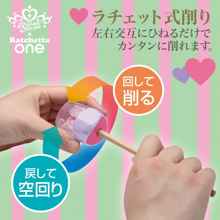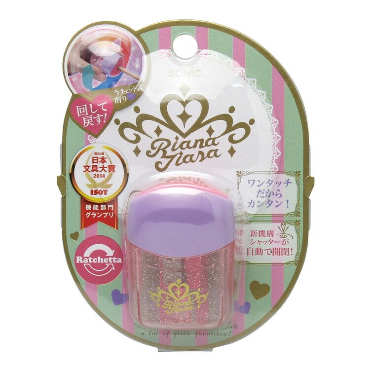 いつでも どこでも だれでも ワンタッチで削れるもっとも簡単なハンディ鉛筆削りラチェット式削りで、左右交互にひねるだけでカンタンに削れます。新機構!シャッターキャップは鉛筆を差すと自動でパカッと開き、抜くと、シャッと自動で閉じます。フタを開ける手間なくワンステップで削れます!キラキララメ入りがかわいいリアナティアラデザイン
