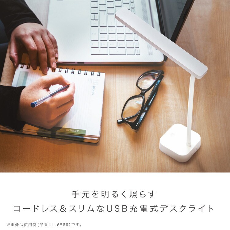 コンセントのない場所でも使えるスリム設計。連続点灯時間 約5.5時間(MAX点灯時)USB充電式なので災害時にも使用でき、軽量で携帯可能。防災対策として枕元に常備しても省スペース。ボタン長押しで無段階調光。場所に合わせてお好みの明るさに調整できます。フレキシブルアームで光の角度を自由自在に調整できます。太陽光に近い昼白色で、目にやさしく長時間の作業・勉強に最適。最大照度 約750lx(直下25cm)光源寿命 約30,000時間充電時間 約3~4時間(使用環境により異なります/専用USBケーブル付)光源 LED20個