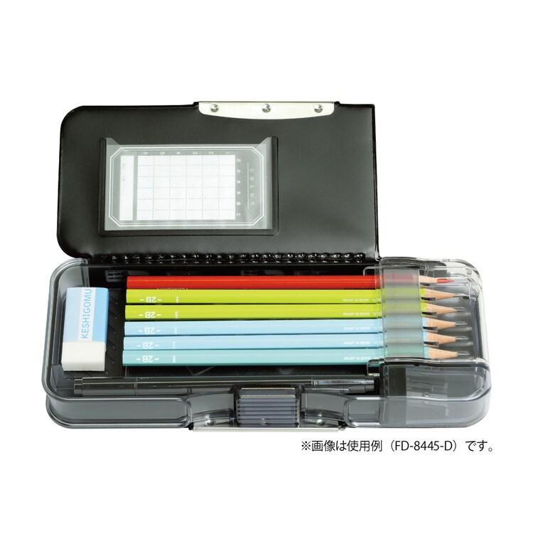 鉛筆の削り忘れ、入れ忘れ…そんなうっかりを解決!こどものうっかりをサポートする「えんぴつチェック両面筆入」フタを開けずに、外側から鉛筆の芯先が見える設計だから、閉じたままでも鉛筆の有無や削り忘れのチェックができる。