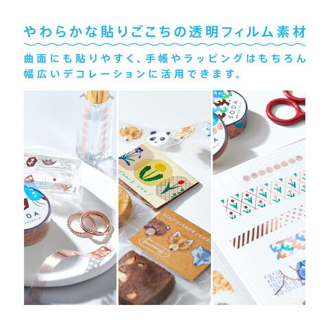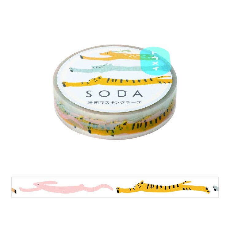 「SODA」は貼ってはがせる透明フィルム素材のマスキングテープです。透明度の高いフィルム素材を使用しているので下地の色を活かして貼ったり、複数枚を重ねて貼っても透明感を楽しむことができます。弱粘着のノリを採用しているため貼り直すことができ、DIYや手帳づくりなどのこだわりたい場面でも安全に使用できます。