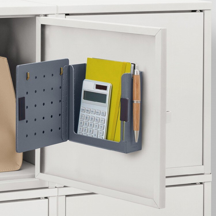 ペグボードの内側の扉開きの収納スペースには、DMやチラシなど紙類も一緒に収納可能。「見せる収納」と「隠せる収納」を同時に実現することができます。