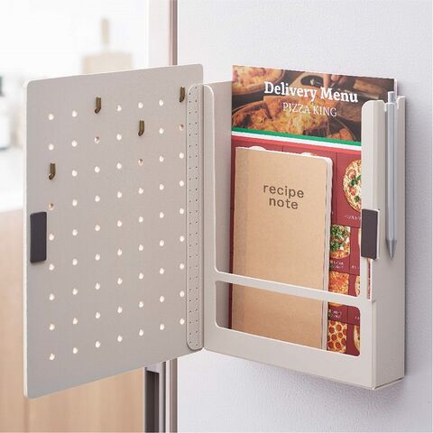 フックで掛けられない物はペグボード扉の内側のスペースに収納可能。玄関に溜まりがちなDM・チラシや予備のマスク、置き場所に困るキッチンのレシピ本など厚みのある物も収納できます。扉が開くので、内側に入れた小物が取り出しやすいのも嬉しいポイントです!
