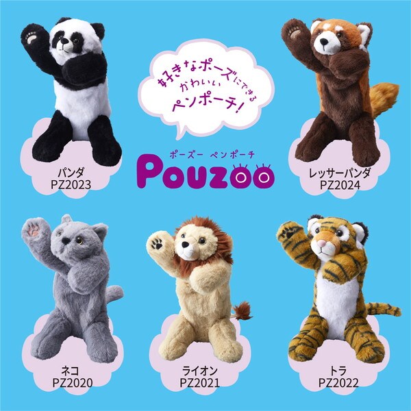 Pouzooペンポーチは色々なポーズをとらせられるぬいぐるみペンポーチです。従来のペンポーチと違い、手・足・背中に骨格パーツが入っているので、身体を自由に動かすことができます。ぬいぐるみを座らせてスタンドペンポーチ使用したり、椅子やパーティションに引っかけたりと楽しみ方は色々!背中部分にはペンを約15本収納できます。