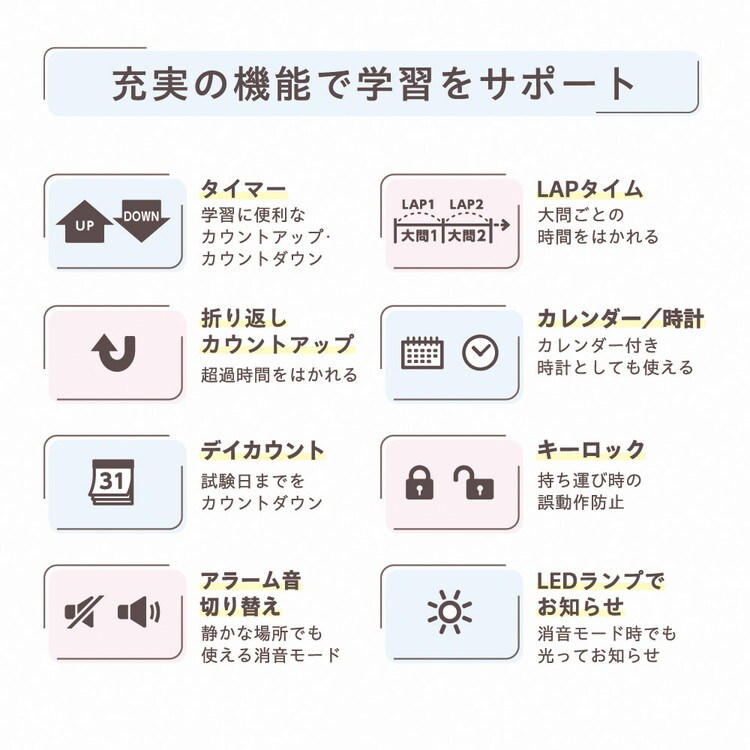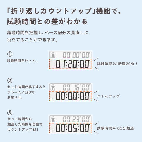 「LAPタイム」機能を搭載の学習タイマーです。大問ごとにかかった時間をはかれるので、大学受験や資格試験の対策におすすめです。手持ちの文房具になじむ雑貨のようなデザインと、充実の機能で、日々の学習をサポートします。