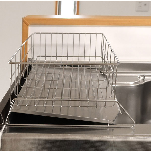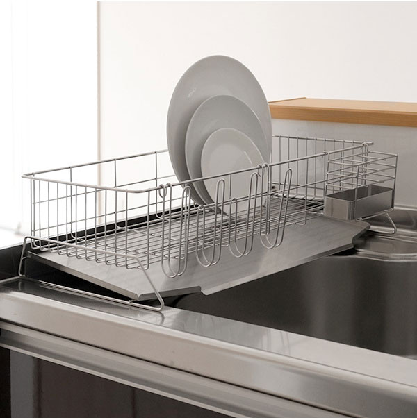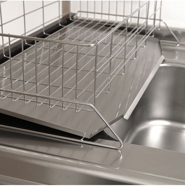 食器から落ちた水は、斜めになった水切りトレーからシンクへ流れ落ちます。
