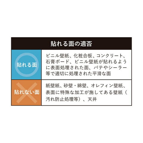 備考:貼る場所のホコリや汚れをタオルでキレイにふき取り、ヒビ割れ、穴・すき間等がある場合は事前に補修してから貼って下さい。作業前に製品を少量切りとり、部屋の目立たない場所で貼ってはがすテストを行ってください。※5℃以下になると剥がれやすくなります。