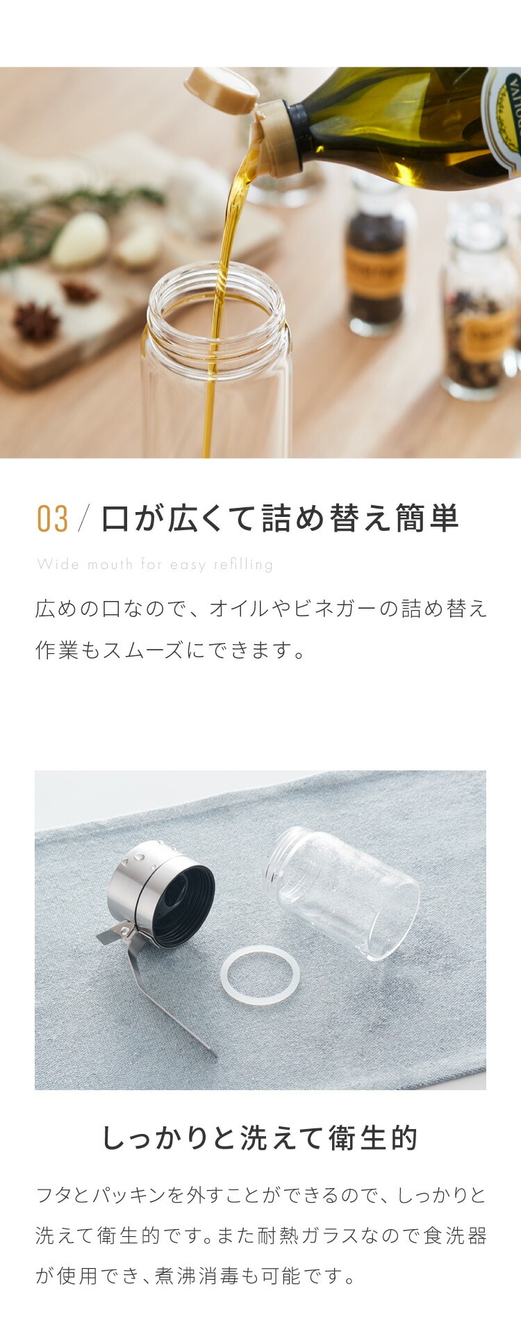 調味料ボトル、オイルボトル、ヴィネガーボトル、ビネガーボトル、液だれしにくい、ボトル、ガラス製、調味料入れ、調味料ポット、オイル、油、酢、ビネガー、ドレッシング、酸化防止、ワンタッチ、開閉、雑貨、ヴィンテージ調、おしゃれ