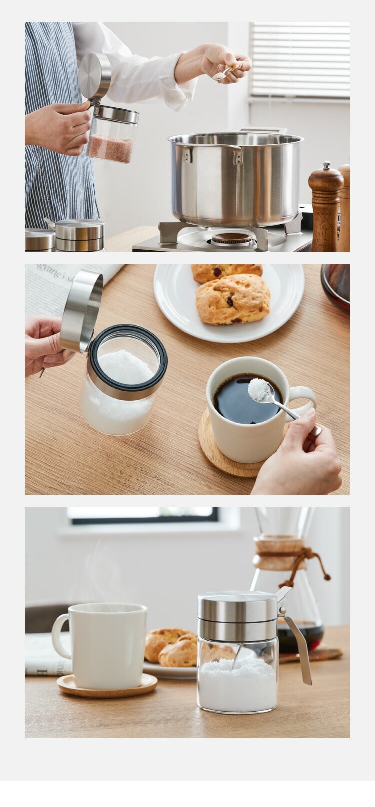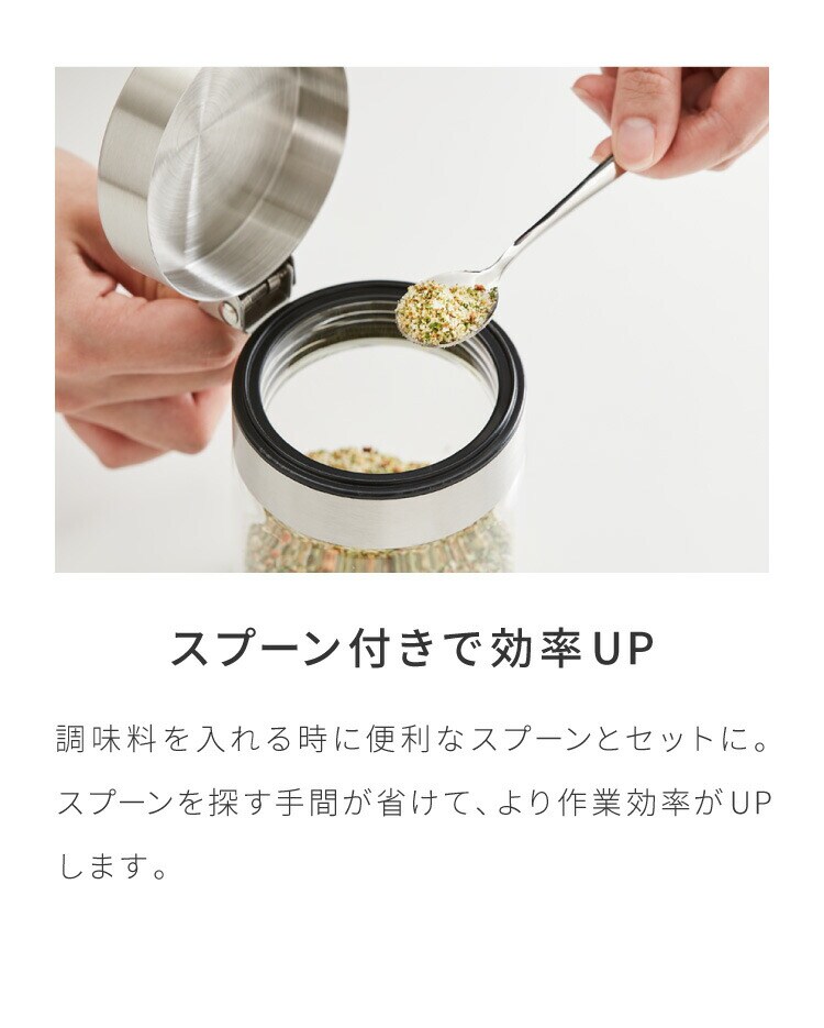 調味料ポット、スプーン付き、調味料入れ、保存容器、塩、砂糖、珈琲、コーヒー、紅茶、だし、調味料、キャニスター、ケース、砂糖入れ、塩入れ、ワンタッチ、開閉、雑貨、ヴィンテージ調、おしゃれ